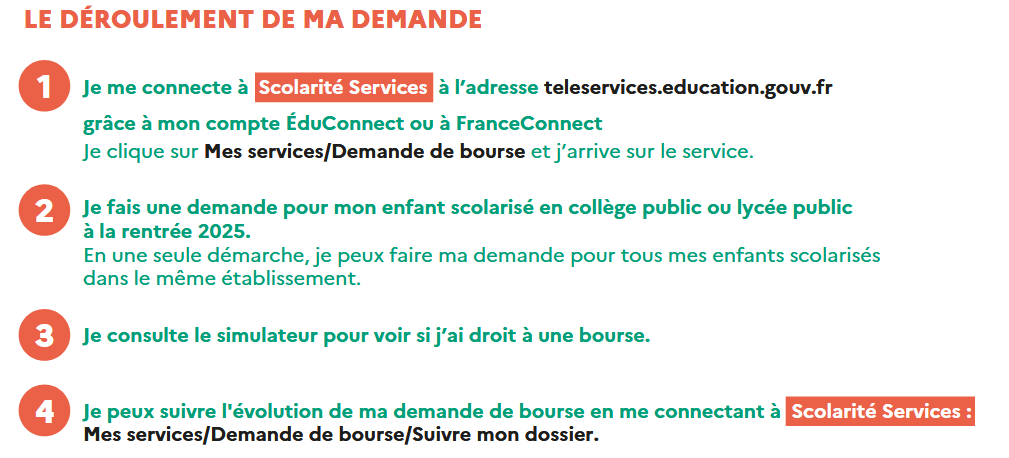 Pour les demandes, du 1er septembre au 16 octobre, les parents ou responsables d'élèves devront se connecter, avec leur compte EduConnect, au portail Scolarité-Services soit en cliquant ici soit en allant dans le menu de l'ENT :. / cliquer sur Téléservices ou via le formulaire Cerfa (en pièce jointe ou téléchargeable en ligne sur le site du ministère https://www.education.gouv.fr/les-bourses-de-college-et-de-lycee-326728 ou à retirer au secrétariat de l'établissement).